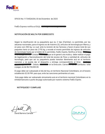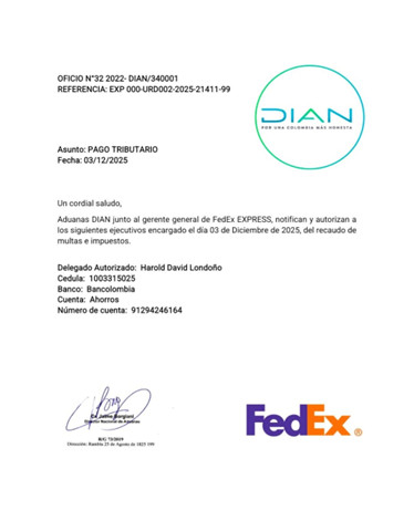 Mediante los documentos identificados, los estafadores buscan presionar a las víctimas con supuestos cobros urgentes con correos y notificaciones falsificadas en las que simulan comunicaciones oficiales de la DIAN, combinadas con el logo de la empresa de mensajería para solicitar consignaciones a cuentas bancarias personales. Estas comunicaciones incluyen números de cédula, supuestos “delegados autorizados», firmas imitadas y referencias a inventados “pagos tributarios», “multas por sobrecosto» o “legalización de mercancía».