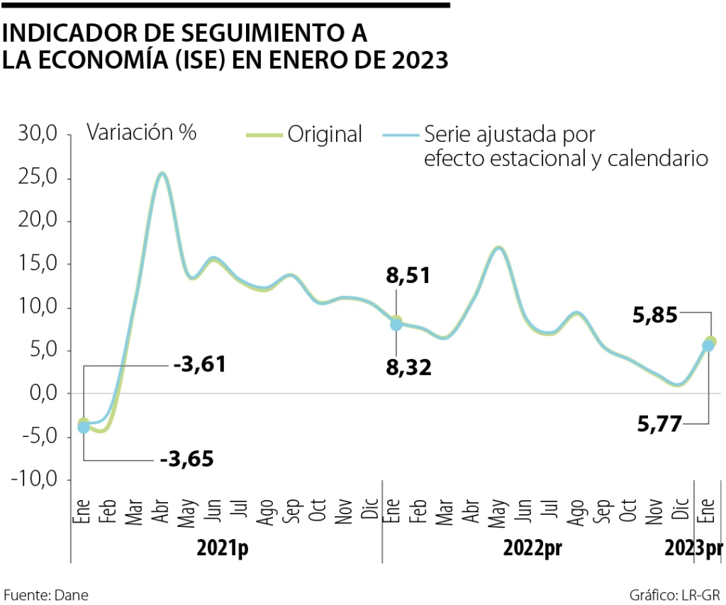 En enero, el Indicador de Seguimiento a la Economía (ISE) se ubicó en 115,10, lo que significó un crecimiento de 5,85% frente al mismo mes de 2022, cuando estaba en 108,74.