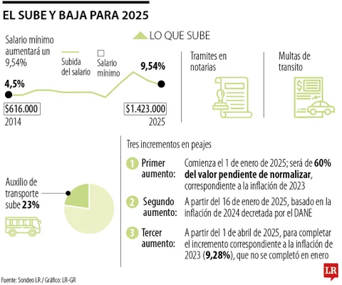El salario mínimo para 2025 será de $1.423.500, sin contar el subsidio de transporte. Además, en 2025 se registrarán aumentos en algunos trámites notariales y en las multas de tránsito. Estas sanciones y trámites están tasados en salarios mínimos diarios, que en 2024 eran de $43.333, y en 2025 aumentan a $47.450, con una diferencia de $4.117.