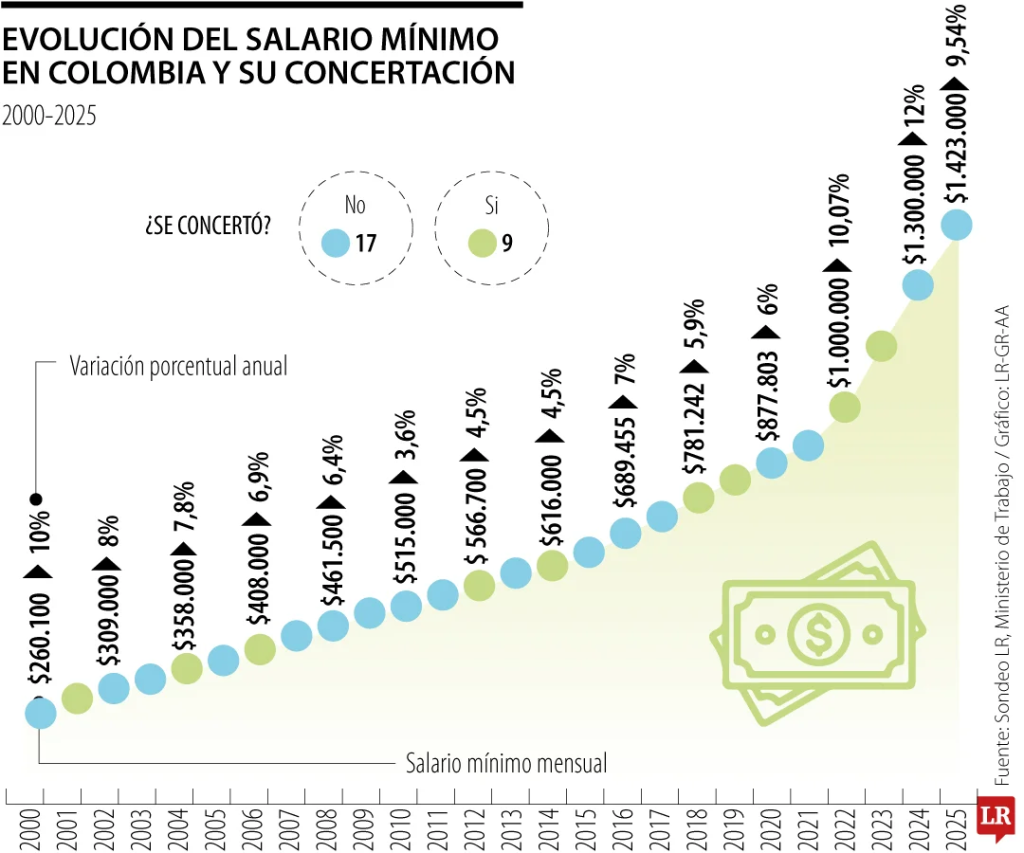 Un documento de investigaciones económicas de Bancolombia dice que con un incremento de esta magnitud, con el que el salario mínimo llegaría a $1,58 millones, la inflación del próximo año cerraría en 4,41%, casi un punto y medio arriba de la meta del Banco de la República. De llegar a concretarse, el banco central completaría seis años consecutivos sin cumplir la inflación objetivo.